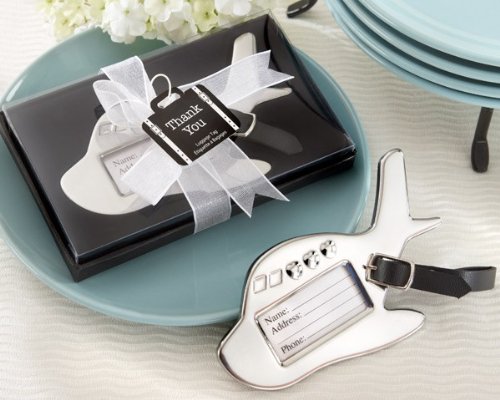 Have your boarding pass ready and grab your carry-on! Travel buffs and frequent fliers alike will adore the utility of this special little favor. What a great way to thank your guests for traveling to your event. Each airplane shaped tag is forged from heavy weight chrome and adorned with three heart shaped passenger windows. Attached is a black adjustable leather strap. These luggage tags could easily double as place card holders. Each luggage tag comes packaged in a black bottom gift box with sheer organza ribbon and retro luggage thank you tag. Measures 3 1/4"x2 1/4".