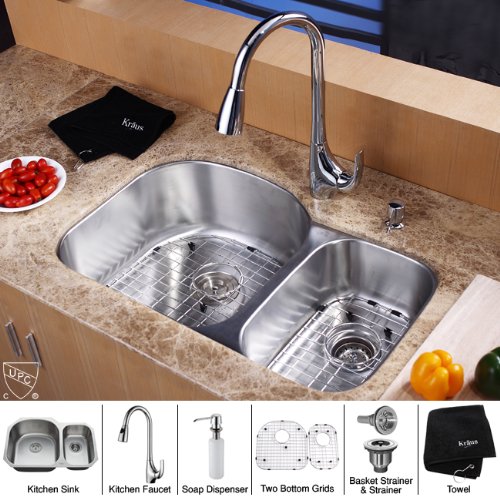 Add an elegant touch to your kitchen with unique Kraus kitchen combo. Kitchen Sink. Kraus kitchen sink boasts 16-gauge premium grade T-304 stainless steel construction. Scratch-resistant commercial-grade premium satin finish. Padded and Stone Guard undercoated insulation over a rubber pad reduces noise while sink is in use. Features unique Kraus 0.75-inch radius curved corners for easy cleaning and a stylish look. Set of stainless steel bottom grids with protective feet and bumpers, Stainless steel basket strainer, Stainless steel strainer and Dish towel are included. Mounting and installation brackets, cutout template are included. 31.5 inches L x 20.5 inches W x 9 inches H (overall sizes). 17.75 inches L x 18.5 inches W x 9 inches H (bowl sizes). 10.5 inches L x 16 inches W x 7 inches H (bowl sizes). Certified and Listed by UPC, cUPC, CSA, IAPMO, ANSI and SCC. Limited Lifetime Warranty. Faucet. Faucet is constructed from solid brass with stunning triple plated chrome finish. Features dual pull-out spray head with an aerated flow or a powerful spray. Spring-tensioned retractable hose. Spout swivels 360-degrees. Contains Sedal drip-free ceramic cartridge. Hermetically sealed with adjustable temperature and flow rate limitation. Single-lever water and temperature control. Single-hole, top-mount installation. Water pressure tested for industry standard. Standard US plumbing connections. 2.2 GPM flow rate. Installation in a 1.375-inch hole. All mounting hardware and hot/cold waterlines are included. Faucet height: 18.5 inches. Spout height: 10.5 inches. Spout reach: 9 inches. Hose measures 24 inches long. ADA compliant. 5 Years Limited Manufacturer Warranty. Soap Dispenser. Soap Dispenser is constructed from solid brass with stunning triple plated chrome finish. Easy-push, self-priming pump. Swivels 360