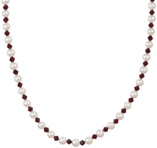 Sterling Silver Clasp White Freshwater Cultured Pearls and Crystallized Swarovski Elements July Birthstone Ruby Colored Bicone Beaded Necklace, 18" Product Description: