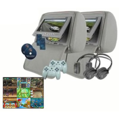 New Dual Headrest DVD Player Monitors & Game System Package for Car/Truck/SUV -- Pair of Headrests with Built-In 7" DVD USB SD VIDEO Monitors, Region Free Dvd Players+ 2 IR Wireless Headphones + 2 Wireless Controllers (Gray) Product Description: