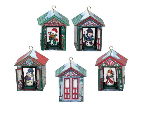 Watch in amazement as the doors to four houses open to reveal miniature animated snowmen. Hang on your tree or place on the tabletop. Five houses comprise a control box and four animated units.