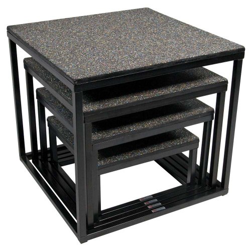 Square tubular steel construction. Tops are reinforced 3/4" plywood covered with 1/8" solid rubber mat. Stackable. Use indoors or outdoors. Black. Plyo boxes sold individually.